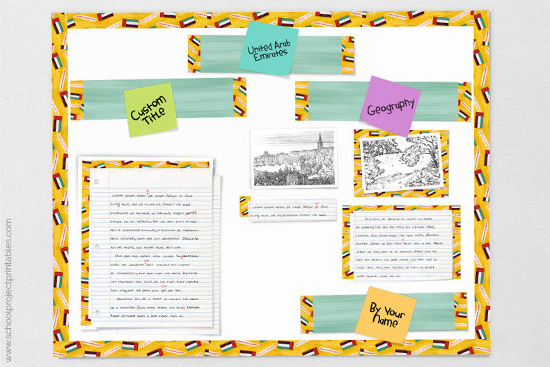 In this step by step tutorial we will use our printable United Arab Emirates (UAE) Project Kit to quickly and easily decorate a poster display for a school report on United Arab Emirates (UAE). The kit can be downloaded from our online store by clicking here.